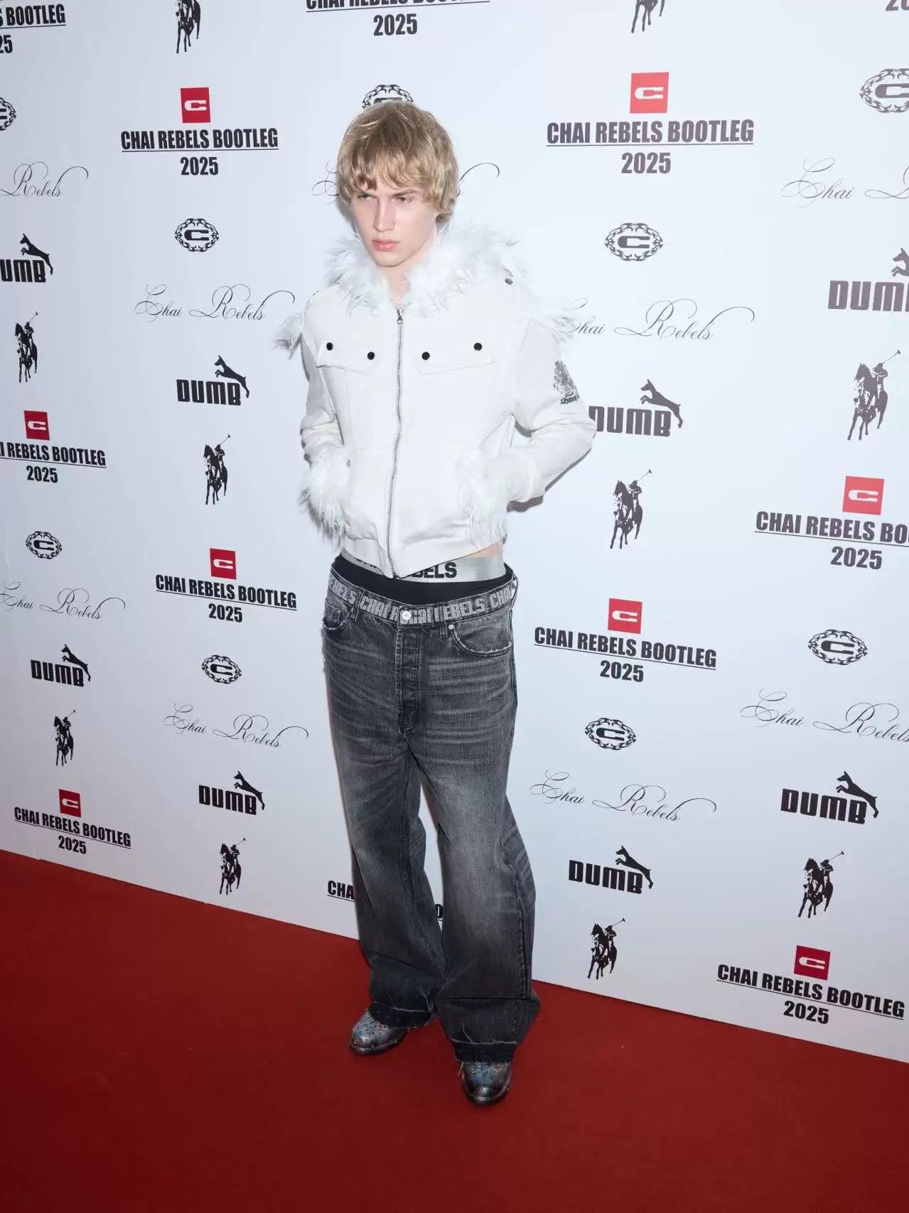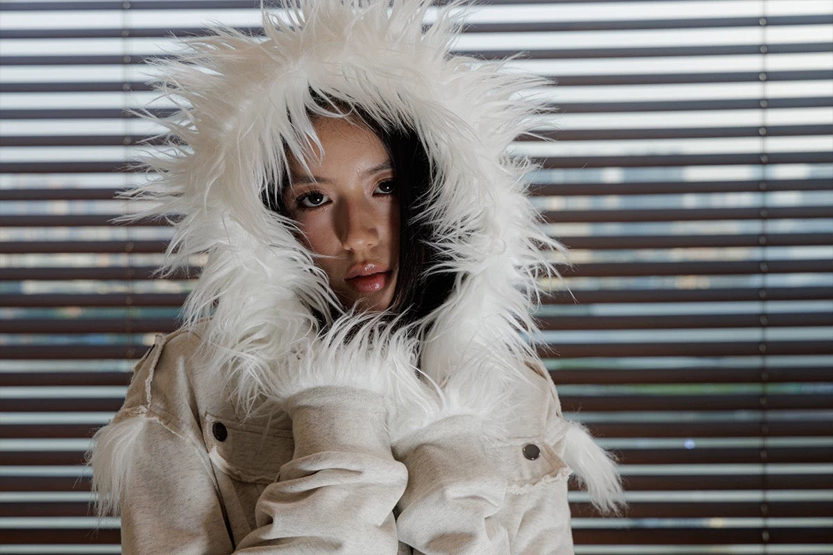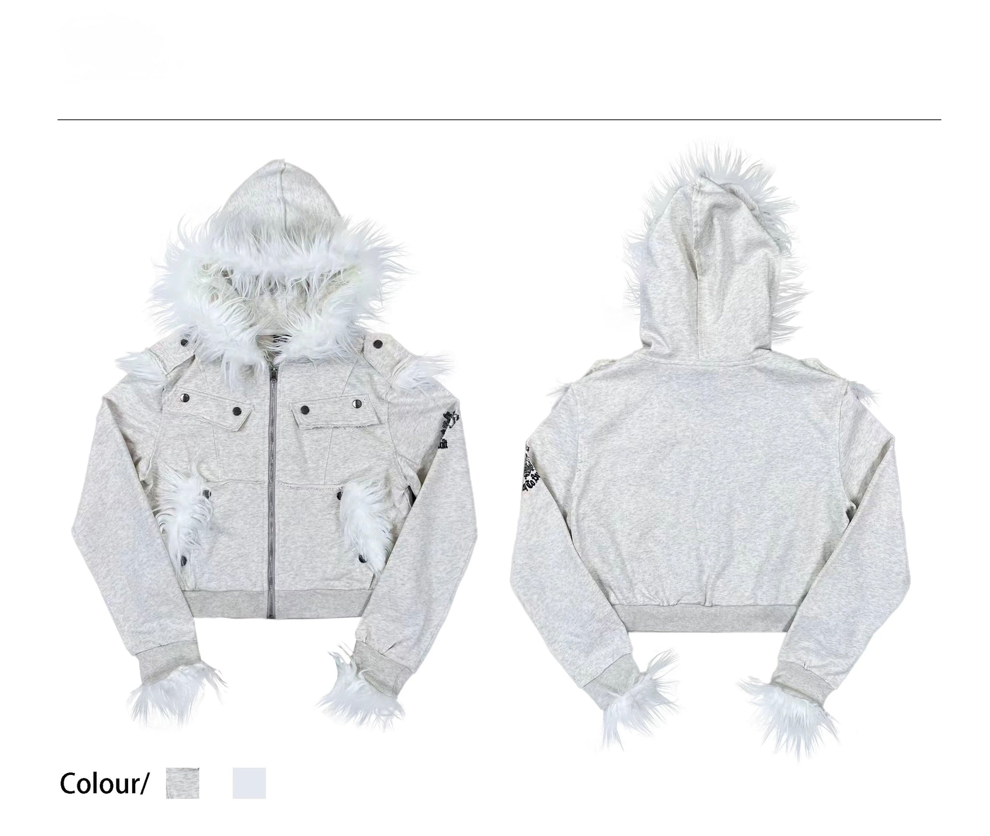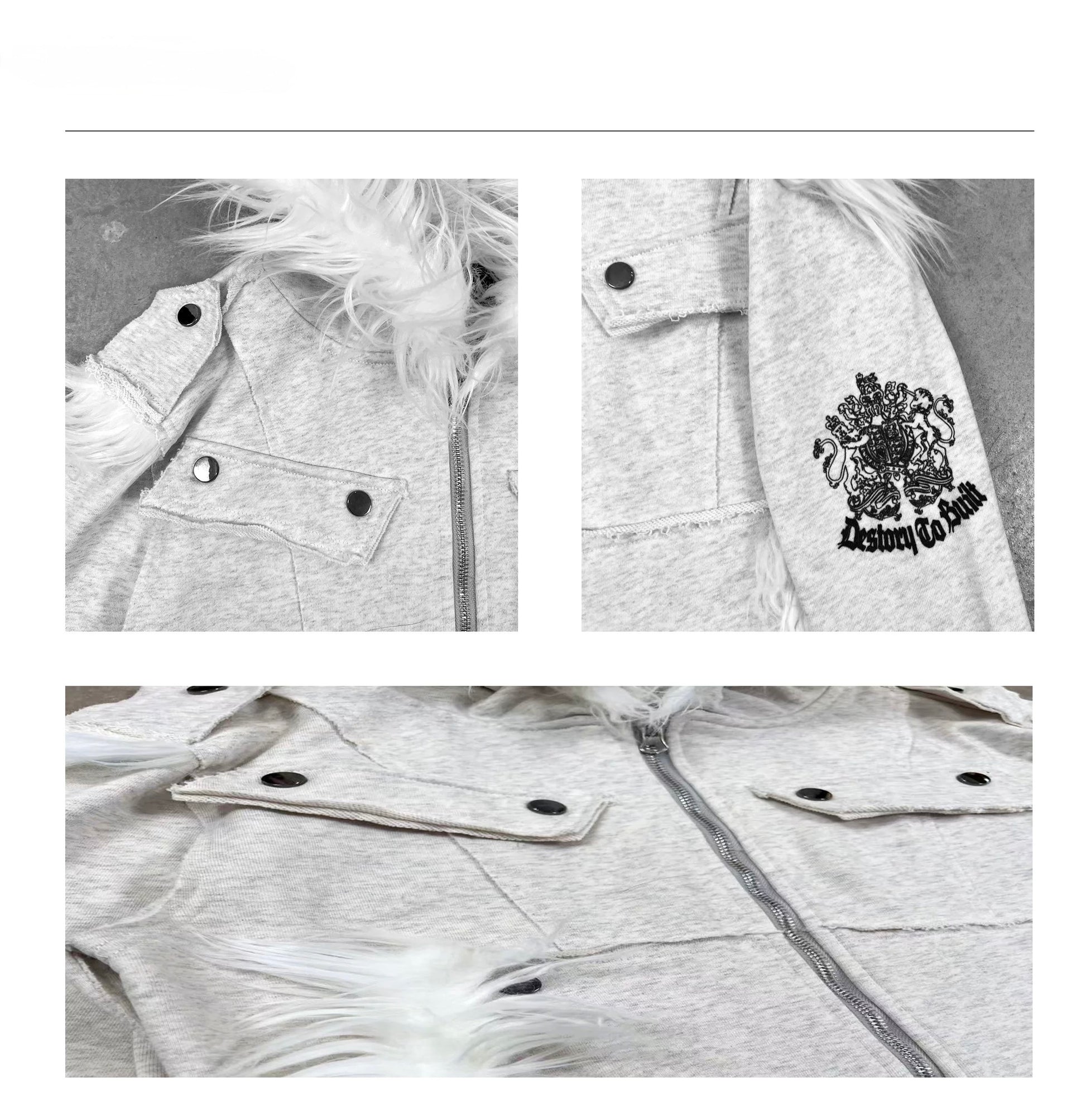 Crest Print Frayed Patchwork Fur Collar Jacket