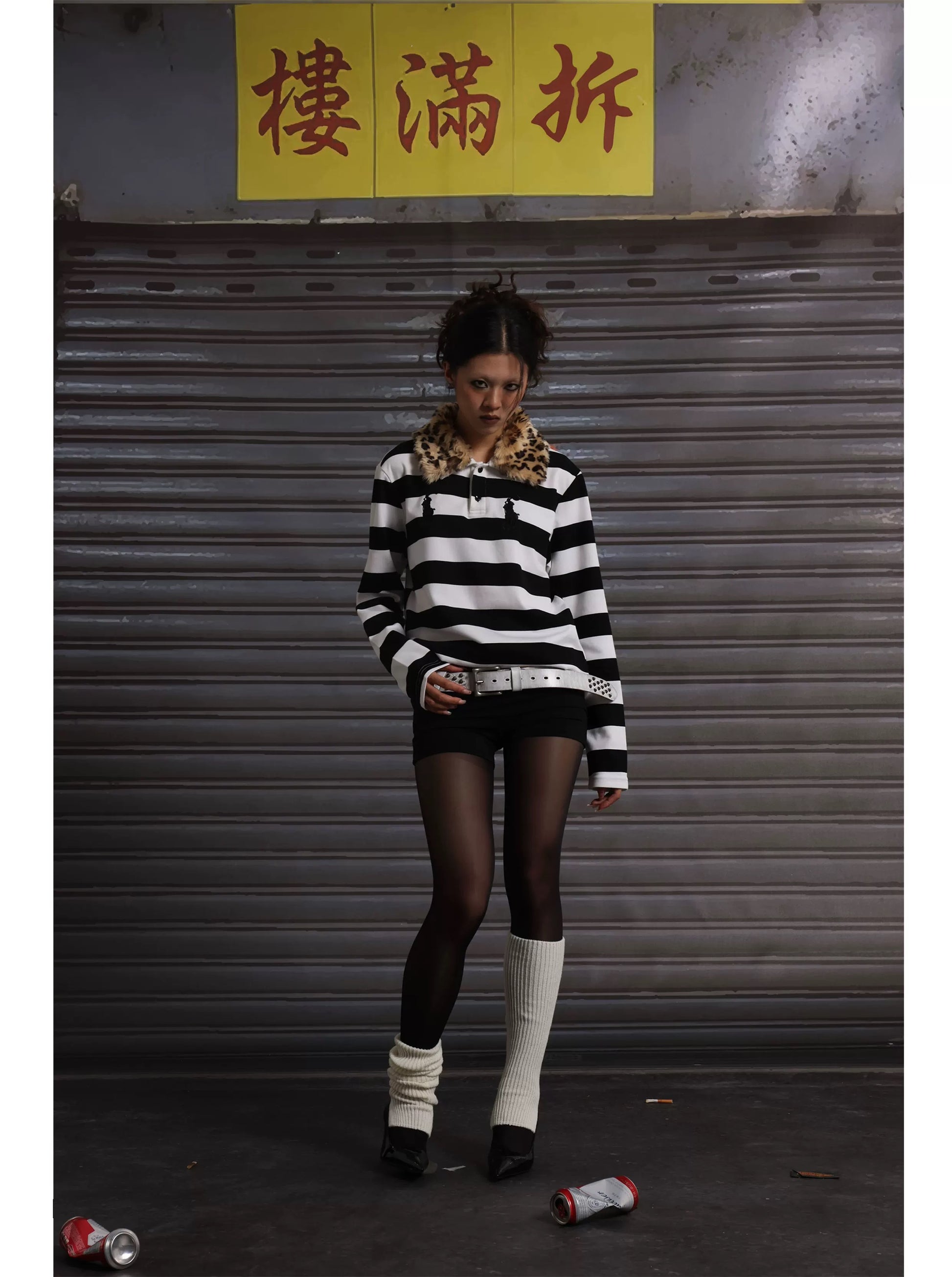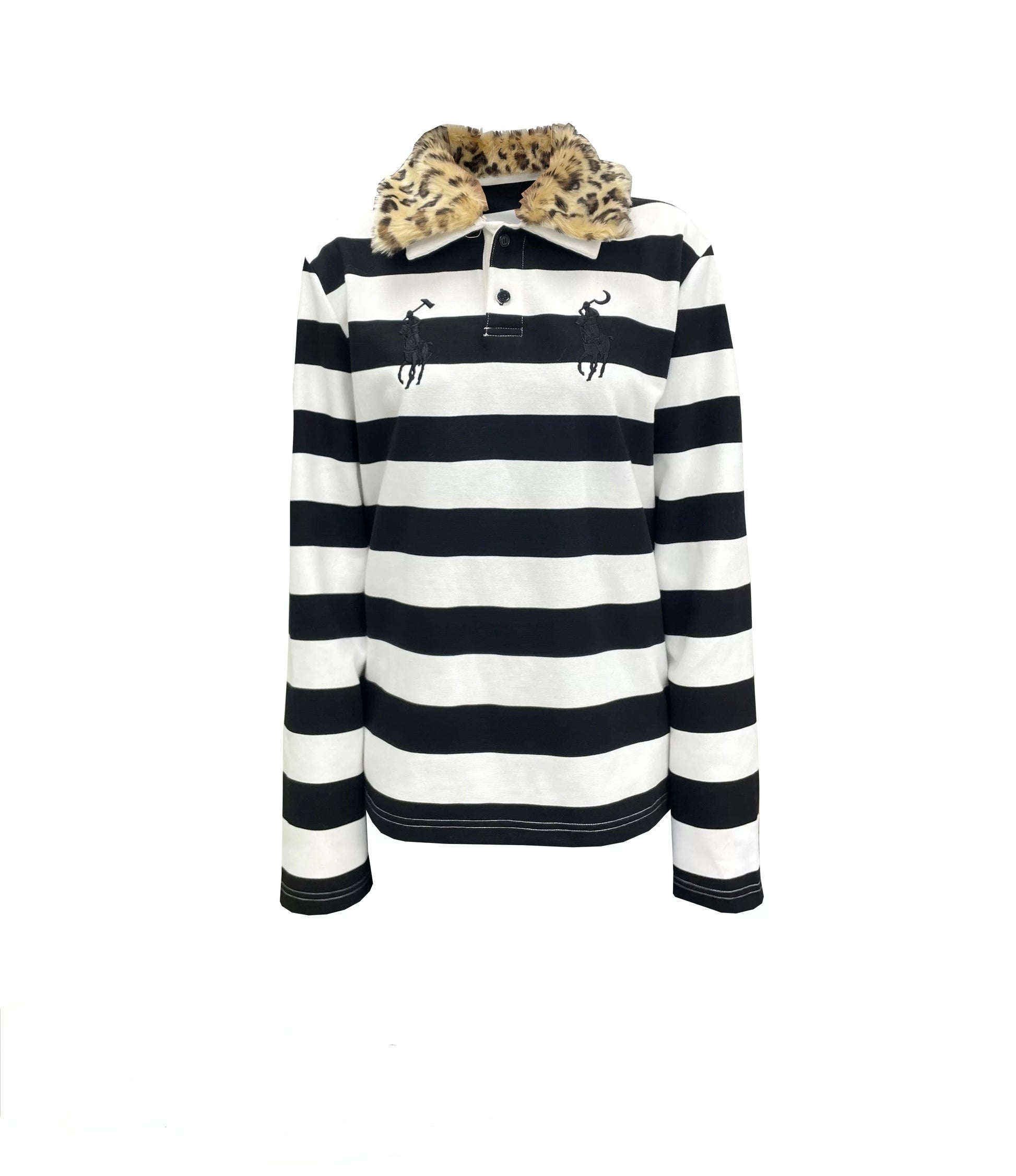 取り外し可能なヒョウ柄の襟付き刺繍コットンポロ